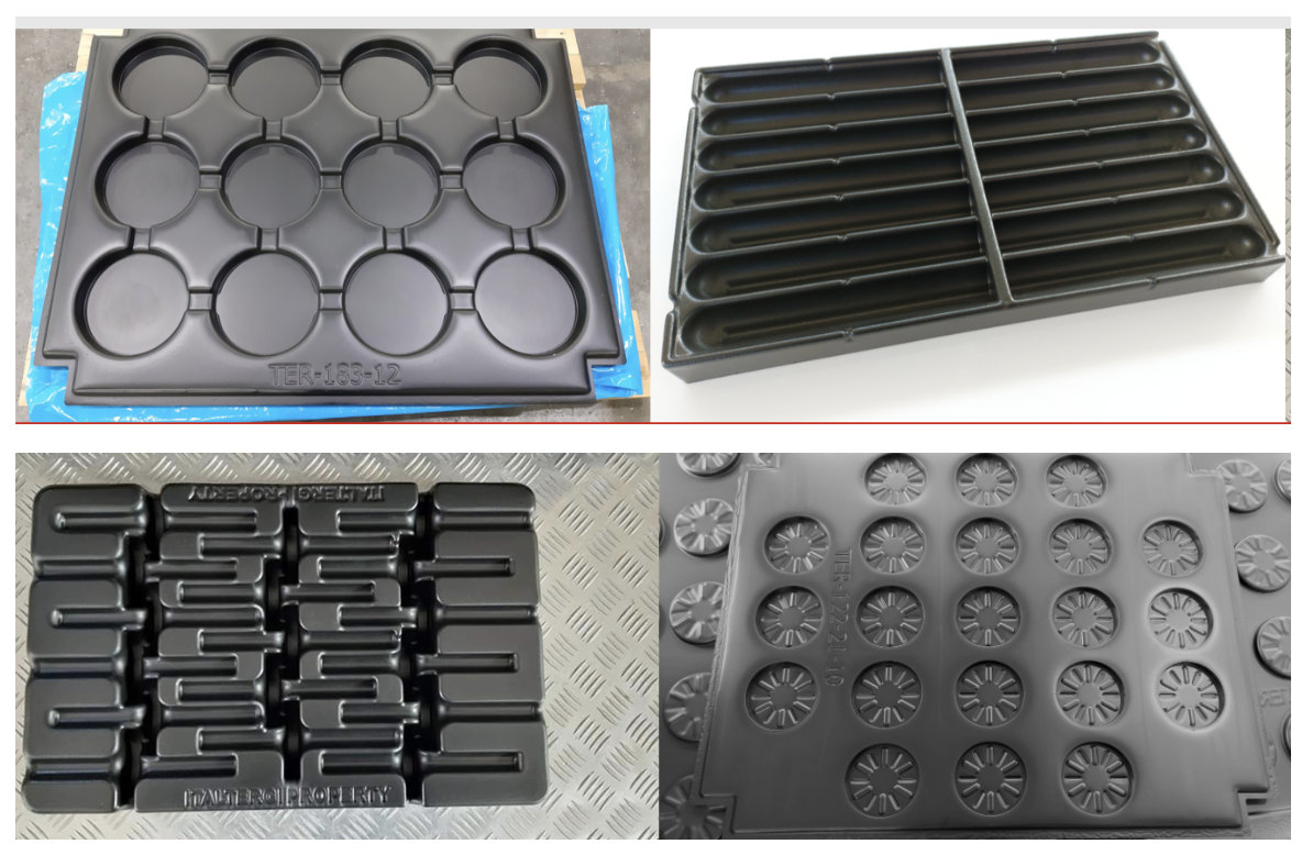 - In diversi materiali, a tutela del prodotto, nella movimentazione interna all'azienda e tra terzisti o per la spedizione al cliente finale, i vassoi termoformati prodotti anche in quantità ridotte possono essere stampati in spessori di pochi decimi di millimetro per quelli a perdere fino a spessori di 6/7 mm per quelli riutilizzabili.